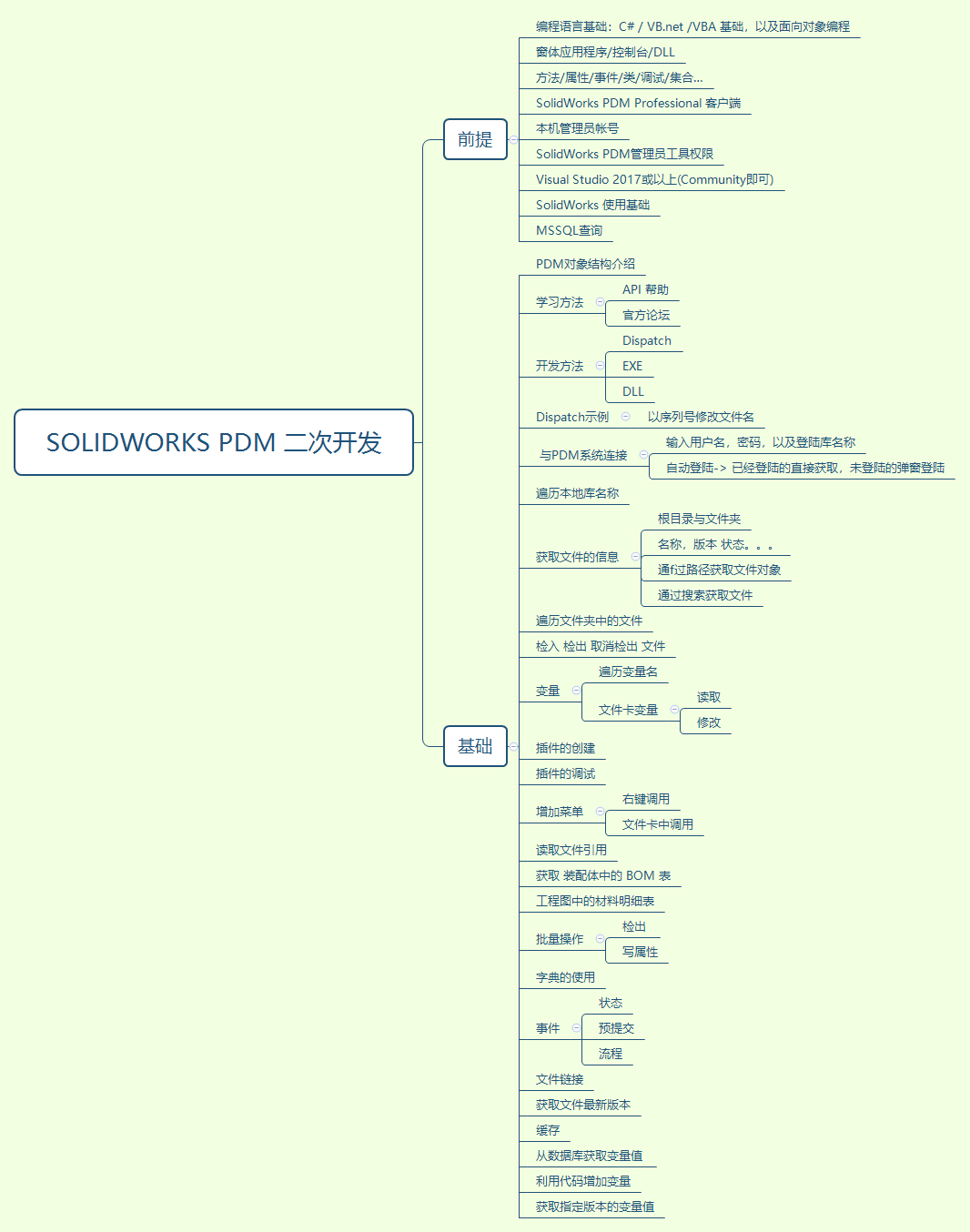 下面这个图列了个Solidworks PDM Professional(Solidworks EPDM)的二次开发大纲,后面有机会慢慢带大家入门。