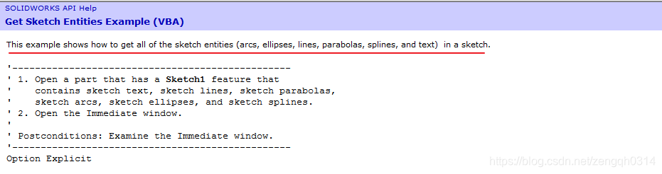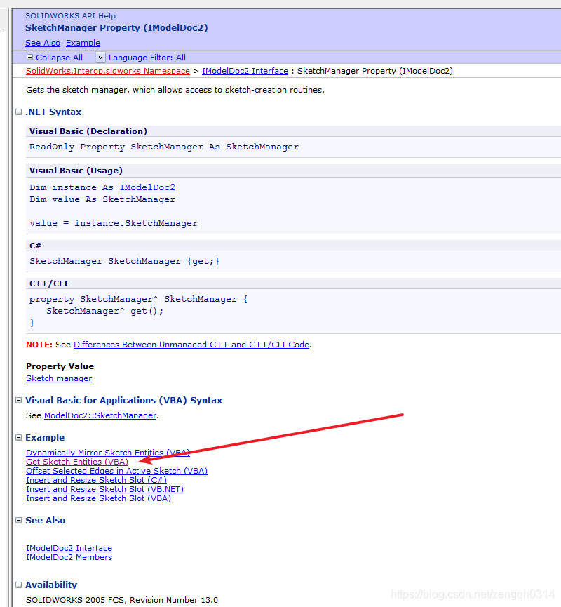 我们去API帮助里面查找SketchManager.很容易就能找到这里有个官方示例。