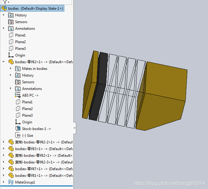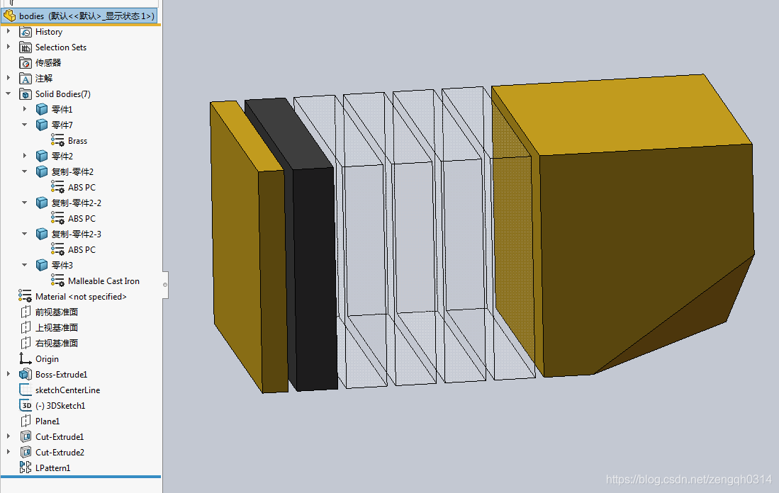 下面是零件: 以多实体进行的设计,实体并且设定了材质。